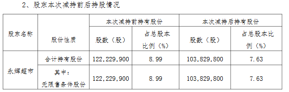 本次权益变动后,永辉超市在红旗连锁的持股由约1.22亿股减少至约1.04亿股,持股比例由8.99%减少至7.63%。