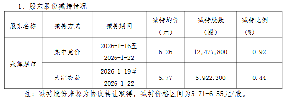 近日,红旗连锁(002697.SZ)发布《股东关于减持公司股份触及1%整数倍的公告》称:持股5%以上股东永辉超市(601933.SH)于2026年1月16日至22日期间减持公司股份。红旗连锁于1月23日接到《永辉超市股份有限公司关于成都红旗连锁股份有限公司股份减持触及1%整数倍的告知函》。