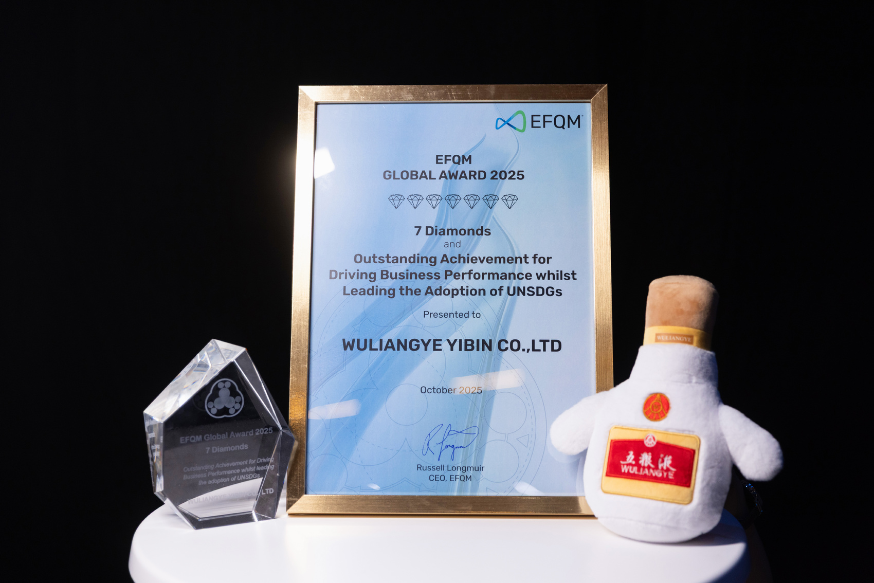2025年10月,在EFQM可持续绩效大会暨2025全球奖颁奖典礼上,五粮液以创奖以来中国企业最高分拿下EFQM全球奖(七钻),同时获得“联合国可持续发展目标践行与企业绩效卓越奖”单项奖。据悉,全球共有200余家企业参评EFQM全球奖,仅14家企业获奖,EFQM首席执行官罗素高度评价其“代表全球最高管理水平,极具标杆借鉴意义”。