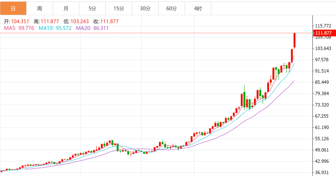 COMEX白银期货涨10%,报111.6美元/盎司,本月累计涨57%。