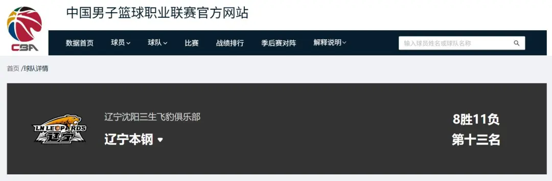 辽宁男篮排名滑落至第13位(来源:CBA官网)