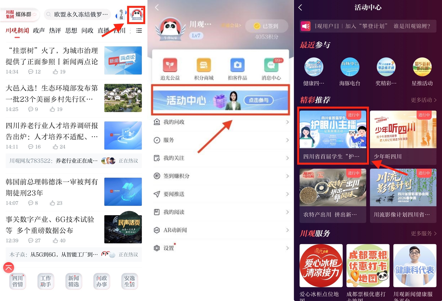 方式二:在川观新闻首页,点击右上角“我的”图标,再点击“活动中心”,找到四川省首届学生“护眼小主播”征集展播活动图片,点击进入为喜爱作品点赞。