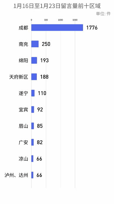 各市州及天府新区的留言量分别为:成都1776件、南充250件、绵阳193件、天府新区188件、遂宁110件、宜宾92件、眉山85件、广安82件、凉山66件、泸州66件、达州66件、德阳47件、自贡44件、乐山41件、内江41件、广元40件、资阳35件、巴中34件、阿坝23件、攀枝花20件、雅安13件、甘孜2件。
