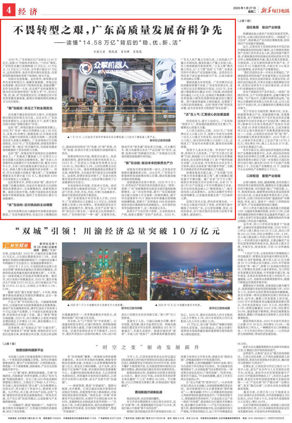 新质生产力在约束下成势。从实验室到生产线,创新正重塑广东的产业形态。2025年,广东无人机产量占全国九成,工业机器人产量占全国四成,服务机器人产量占全国八成。在土地资源紧约束的深圳,“工业上楼”模式破土而出,让“上下楼”变成“上下游”,在垂直空间中开辟出产业发展新天地。这些在压力和约束下成长起来的新兴产业,正成为驱动未来的核心引擎。