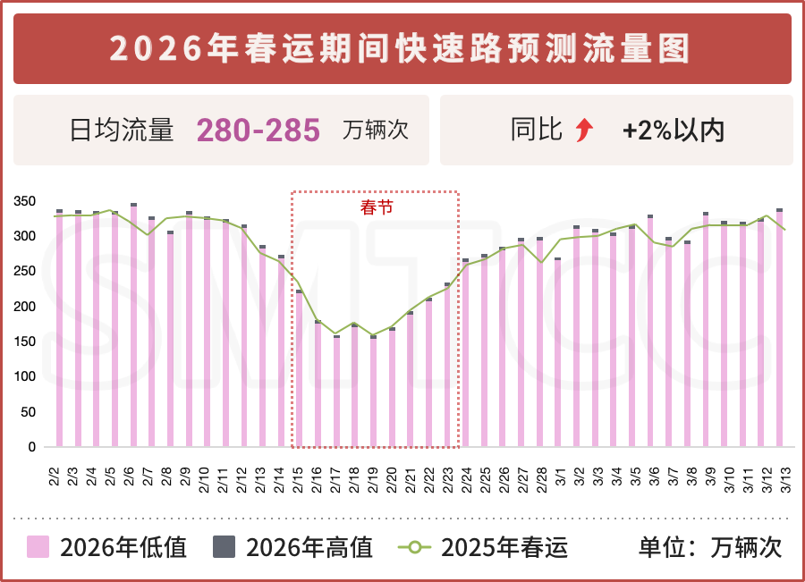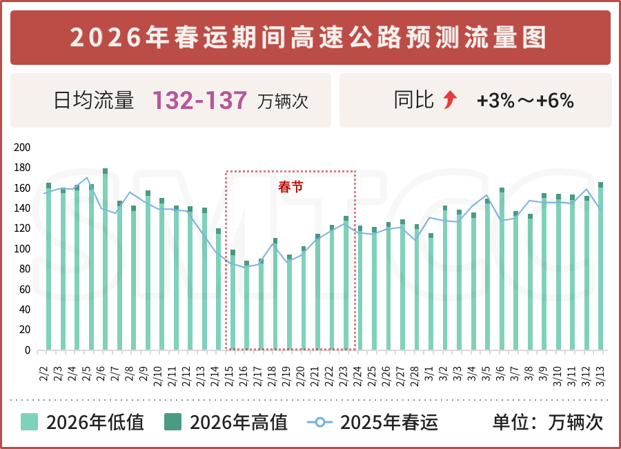 随着探亲流、学生流、务工流、旅游流多重叠加,2026年春运期间出行需求持续增长,高速公路流量呈上升趋势。预计2026年春运期间高速公路日均流量132万~137万辆次,同比增长3%~6%。