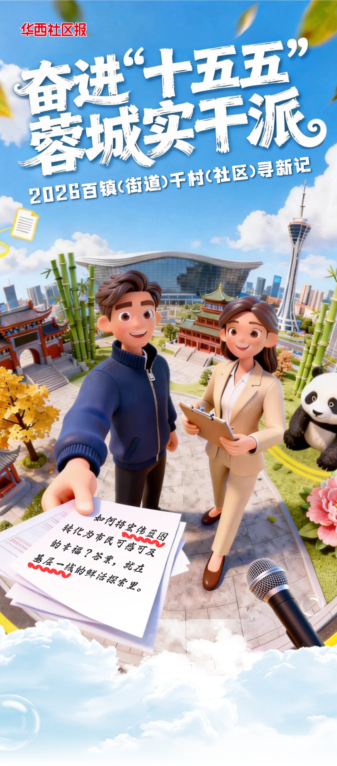 “十五五”开局之年,蓉城大地涌动着马不停蹄的奋斗劲头。如何将宏伟蓝图转化为市民可感可及的幸福?答案,就在基层一线鲜活的探索里——从智慧治理的新场景到社区议事的新机制,从家门口的新业态到“15分钟生活圈”的品质提升,每一个“新抓手”、每一处“新刻度”,都源自一线实干家的破局与创造。即日起,本报推出“奋进‘十五五’ 蓉城实干派”——2026百镇(街道)千村(社区)寻新记系列报道。我们将追随奋蹄之声,深入街巷楼宇,记录那些将规划图变为实景画的基层奋斗者,呈现他们如何以“微创新”推动“大治理”,用“绣花功”织就“幸福圈”。新征程已启,且看基层万千气象,共绘蓉城崭新篇章。