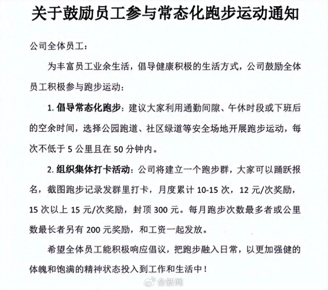 最近几天,在社交平台,一份落款为安徽美迪生态农业有限公司的《关于鼓励员工参与常态化跑步运动通知》引起了不少网友的关注。合新闻记者注意到落款时间是2025年12月11日。