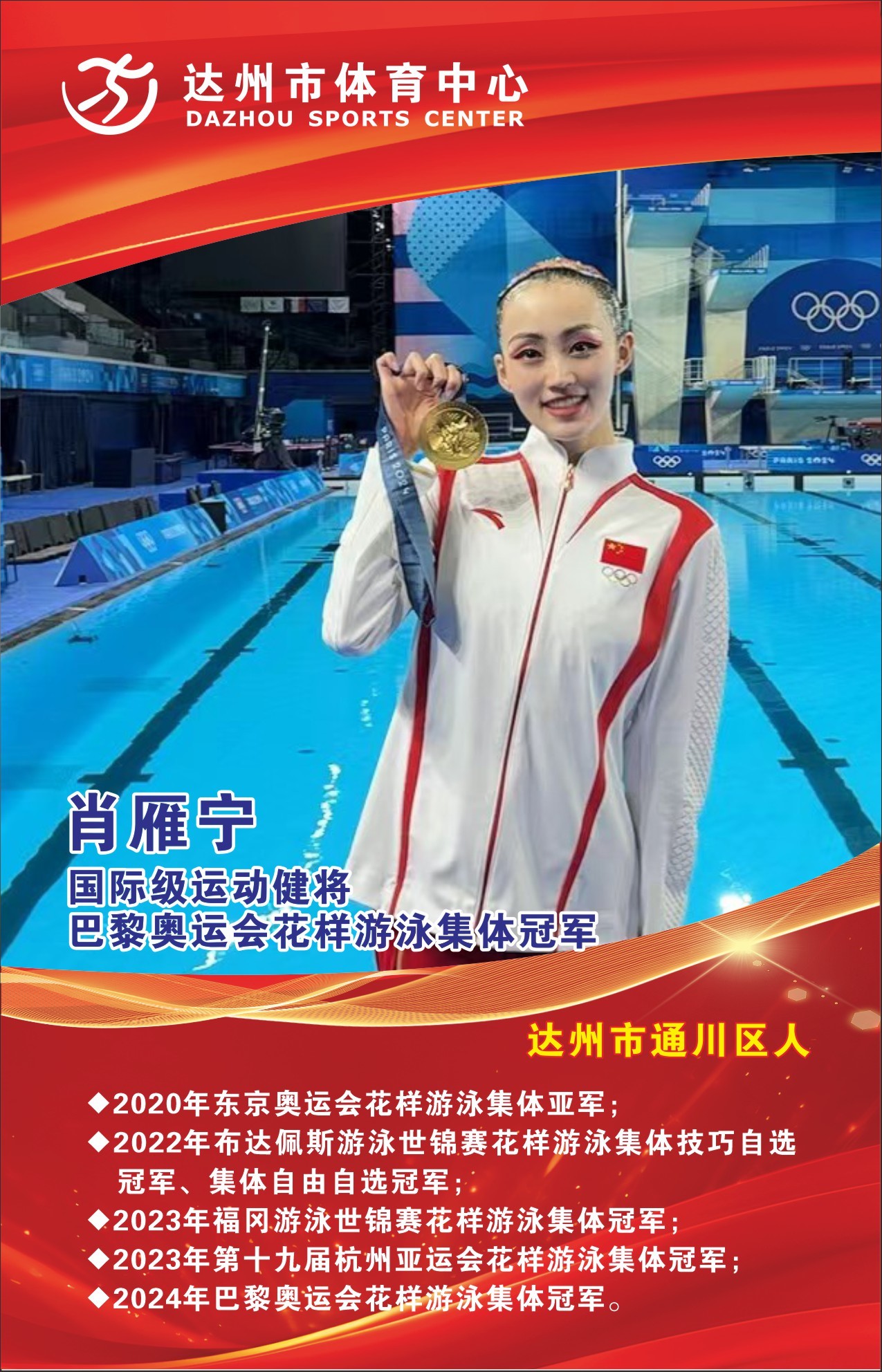 据了解,比赛期间,奥运会集体项目冠军得主、布达佩斯世锦赛集体自由组合金牌得主、雅加达亚运会获集体项目冠军得主、杭州亚运会获集体项目冠军得主、国际级运动健将肖雁宁将到场观摩和开展技术指导。(达州市文化体育和旅游局供图)