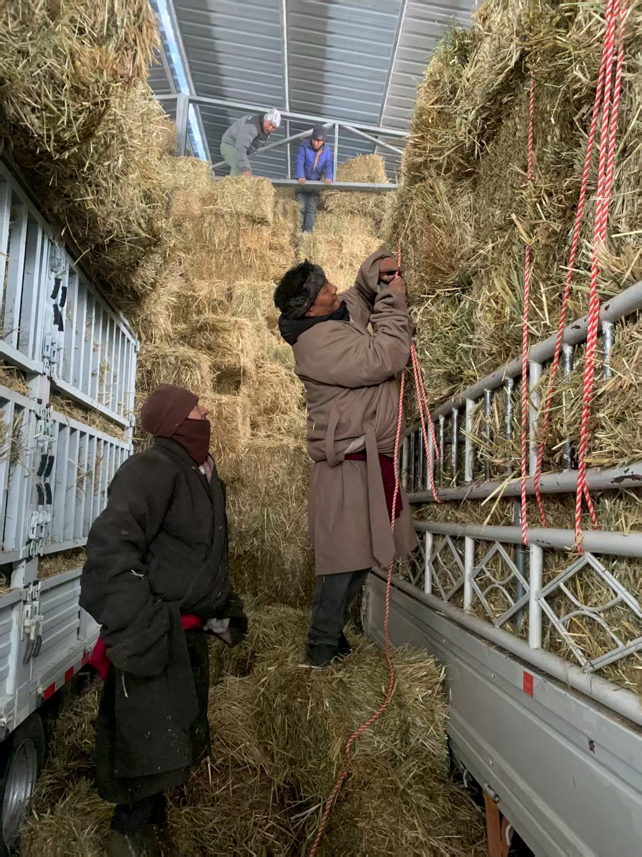 2025年度“四好”农牧民家庭:尼作(前排右)帮助牧民卸草料。红原县委宣传部供图