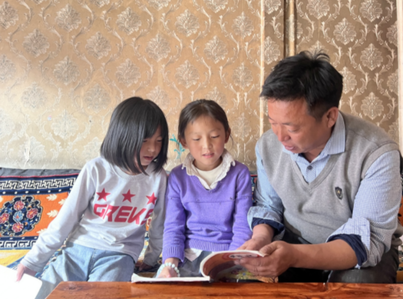2025年度“四好”农牧民家庭:德忠(右)为孩子们辅导功课。壤塘县委宣传部供图