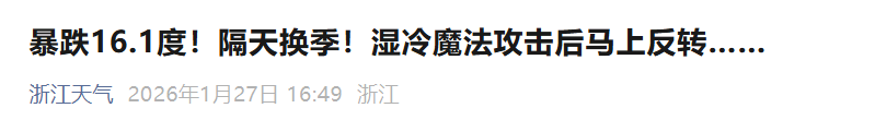 昨天(1月27日)的浙江,一改昨日冰火两重天的局面,在冷空气影响下,浙南地区气温一路下跌,下午3点,全省各地气温全部跌到10℃以下。