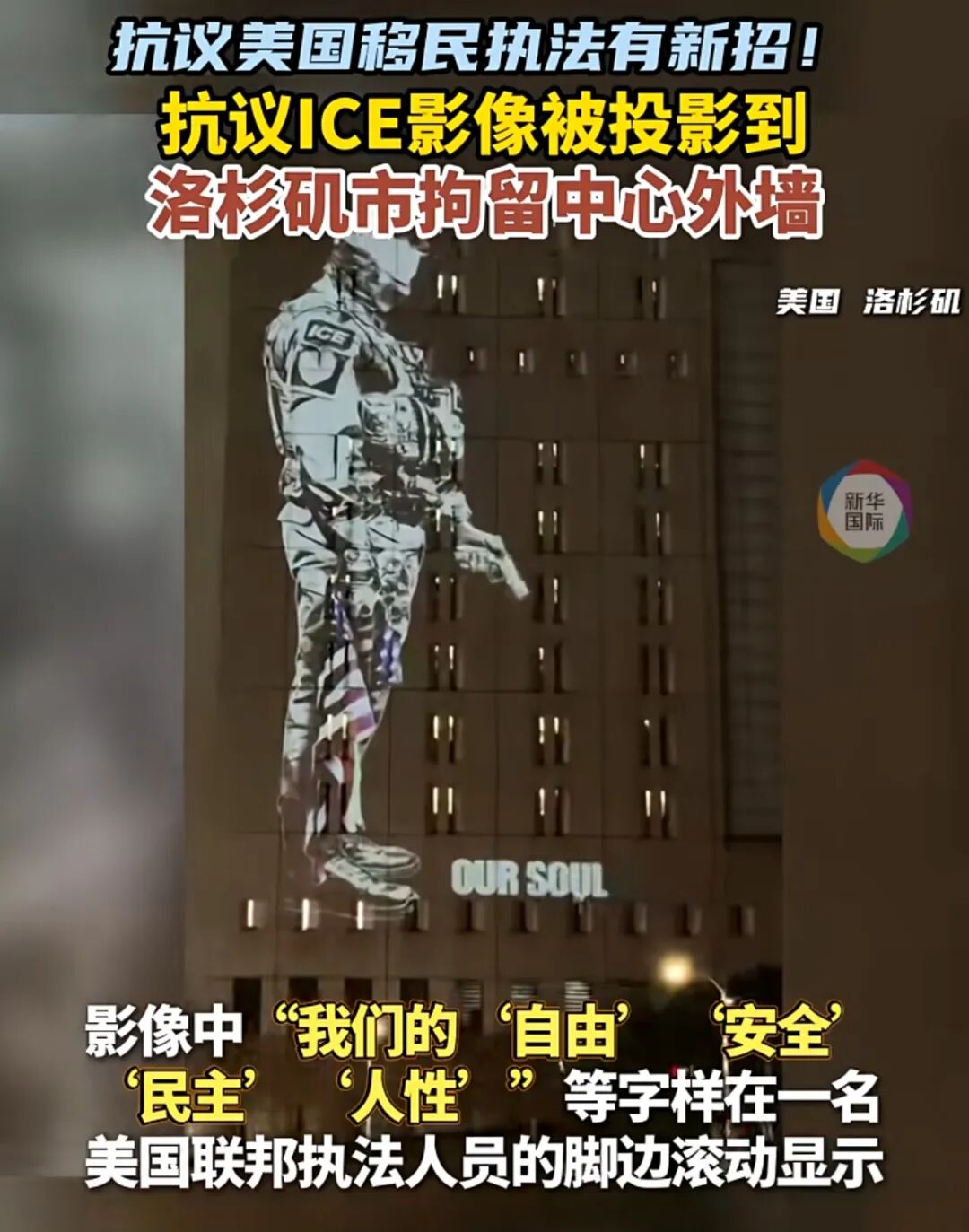 近日,一段抗议美国暴力移民执法的影像被投影到洛杉矶市拘留中心的外墙上。影像中,一名美国移民与海关执法局(ICE)执法人员手拿美国国旗,开枪射击脚边滚动播放的“我们的‘自由’‘安全’‘民主’‘人性’”等字幕。