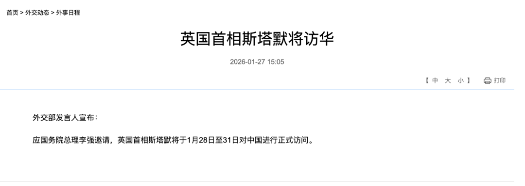 应国务院总理李强邀请,英国首相斯塔默将于1月28日至31日对中国进行正式访问。