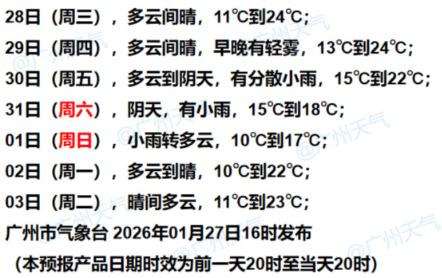 广州市气象台预计,1月28日—29日,广州多云间晴,部分时段有轻雾。