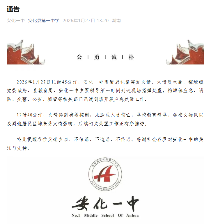 2026年1月27日11时45分许,安化一中闲置老礼堂突发火情。火情发生后,梅城镇党委政府、县教育局、安化一中主要领导第一时间到达现场指挥处置,梅城镇应急、消防、交警、公安、城管等相关部门迅速到场开展应急处置工作。