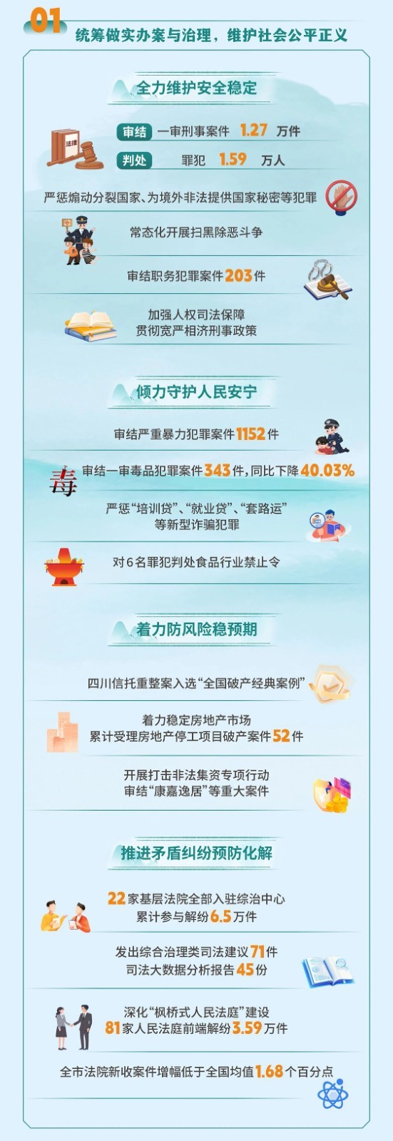 据报告,2025年,成都两级法院受理案件73.92万件、 结案64.39万件, 同比分别增长15.32%、14.85%, 法官人均结案519.27件, 均达历史新高。 其中, 成都中院受理案件7.15万件, 结案6.06万件。全市法院获得省级以上表彰表扬169 项,58件典型案例、17项改革经验在全国推广。