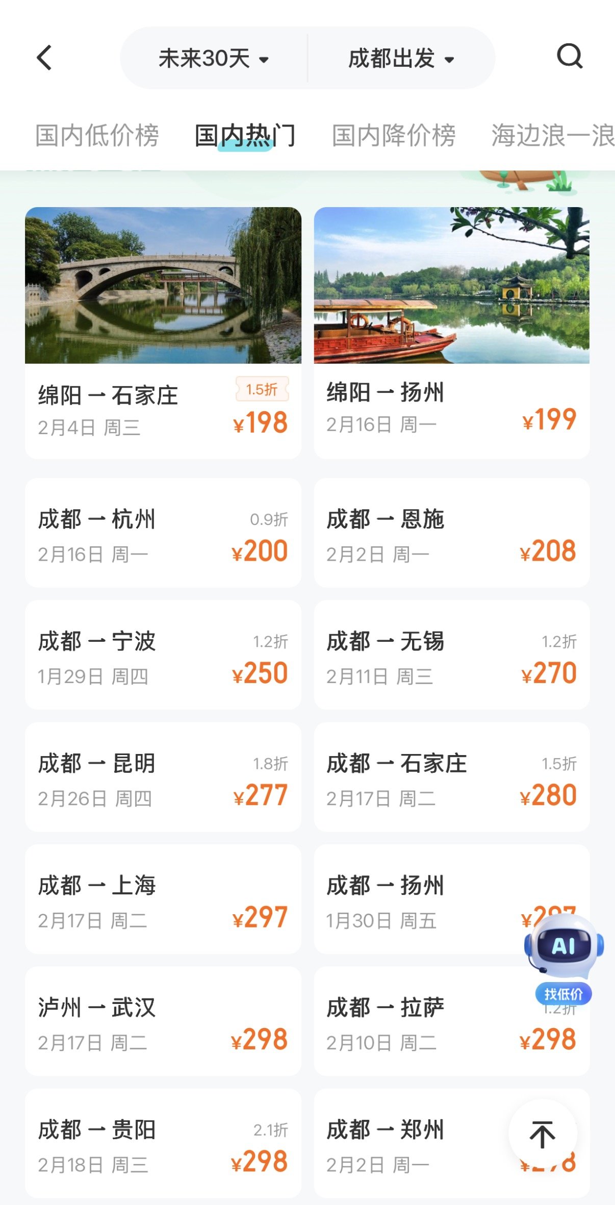 此外,从市(州)出发,也有不少能捡漏低价机票的机会。绵阳直飞石家庄春节前的机票折扣最低3折,大部分价格在300元左右。其中,2月4日当天机票价格最低,票价为175元。节日期间,绵阳到扬州的直飞机票最低为158元。