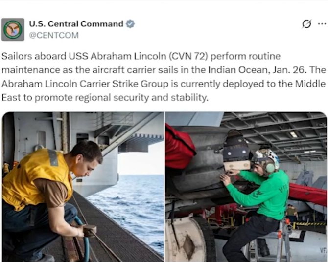 美军中央司令部发文表示,“林肯”号航母打击群“正部署到中东”。新华社视频截图