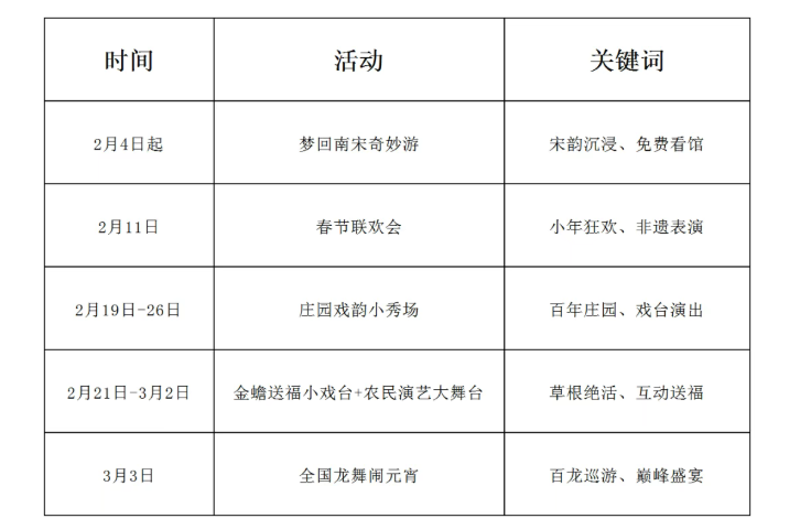 首场活动从2月4日开始,贯穿年前7天+正月初三至初七+3月3日元宵节,泸县宋代石刻博物馆将开启“梦回南宋奇妙游”沉浸式体验,游客可免费参观博物馆,领略宋代石刻文化精髓;晚间更有定制戏剧《石境奇妙游》精彩上演,搭配“泸川宋宴”特色餐饮,实现“看一场戏、吃一场宴、逛一座城”的宋韵年味新体验。
