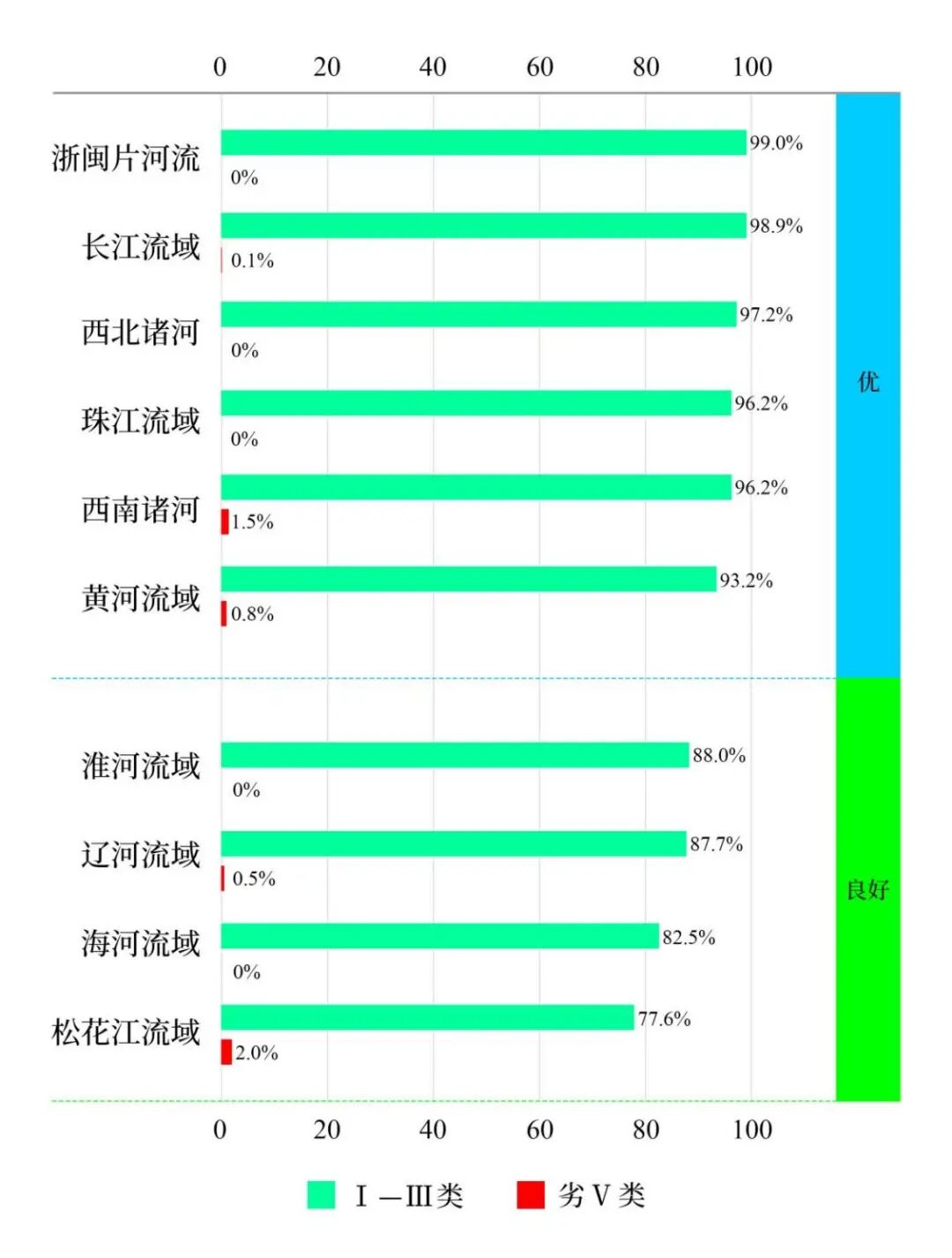 图2 1—12月七大流域和西南、西北诸河及浙闽片河流水质类别比例