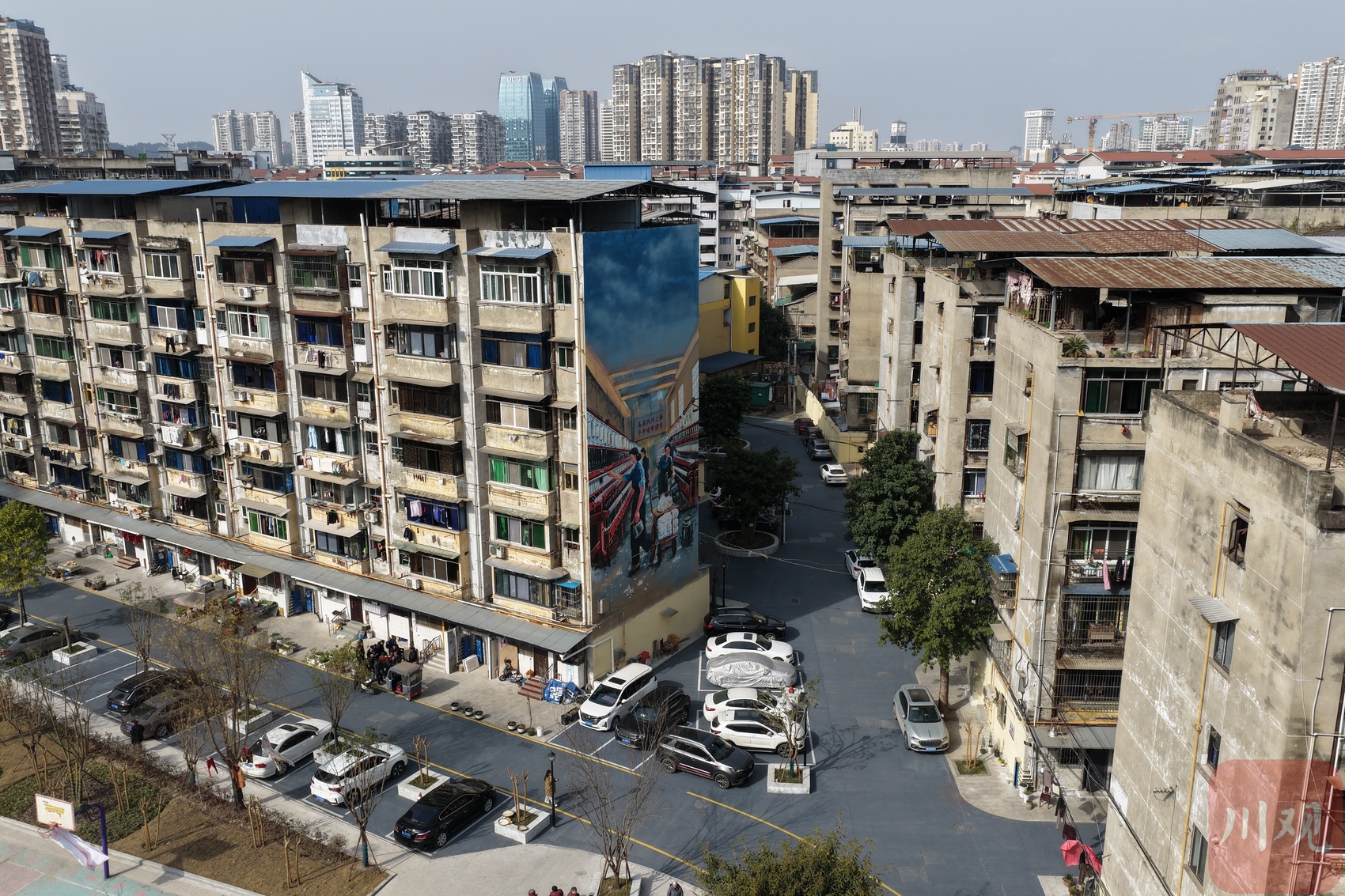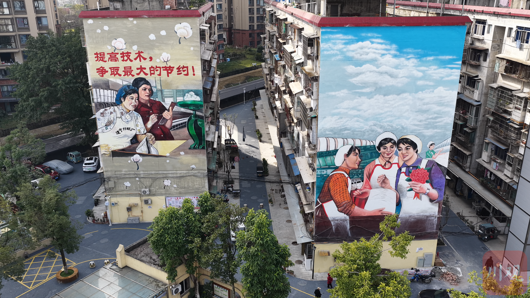 不仅如此,考虑到锦兴小区是原遂宁纺织厂宿舍,改造中还特意设计了融入纺织元素的墙体彩绘,让历史记忆在翻新中得以延续。