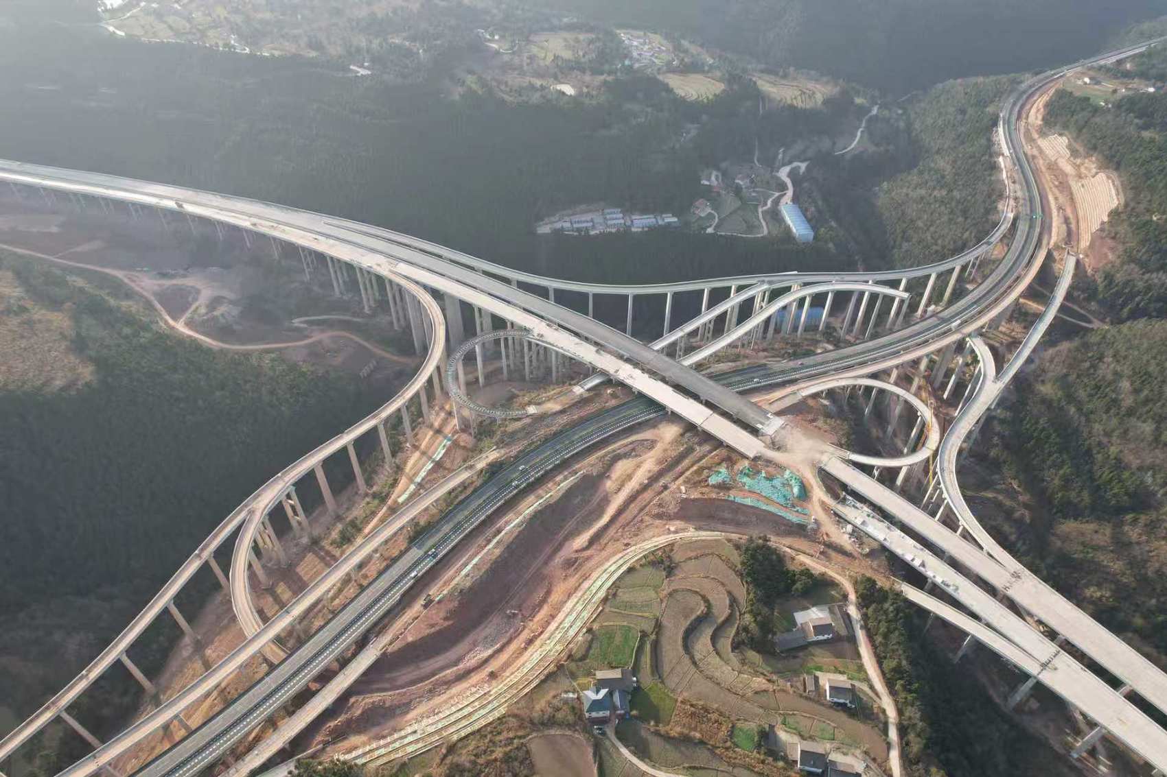 周家河枢纽互通位于广元市昭化区与利州区交界的周家河附近,该枢纽互通共设14条匝道、23座桥梁,包含最高93米的桥墩群和半径52米的极限小半径曲线,并需3次上跨下穿既有高速公路,施工技术难度大,安全风险较高。