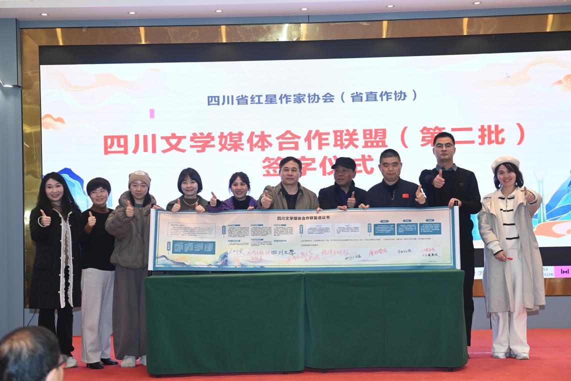 活动中,“四川文学媒体合作联盟”迎来第二批成员。四川文学杂志、廉政瞭望、人力资源报、精神文明报、大众健康报、华西社区报、四川工人日报、西南交通大学出版社、西南财经大学出版社等十余家媒体代表上台签约,文学传播矩阵进一步壮大。
