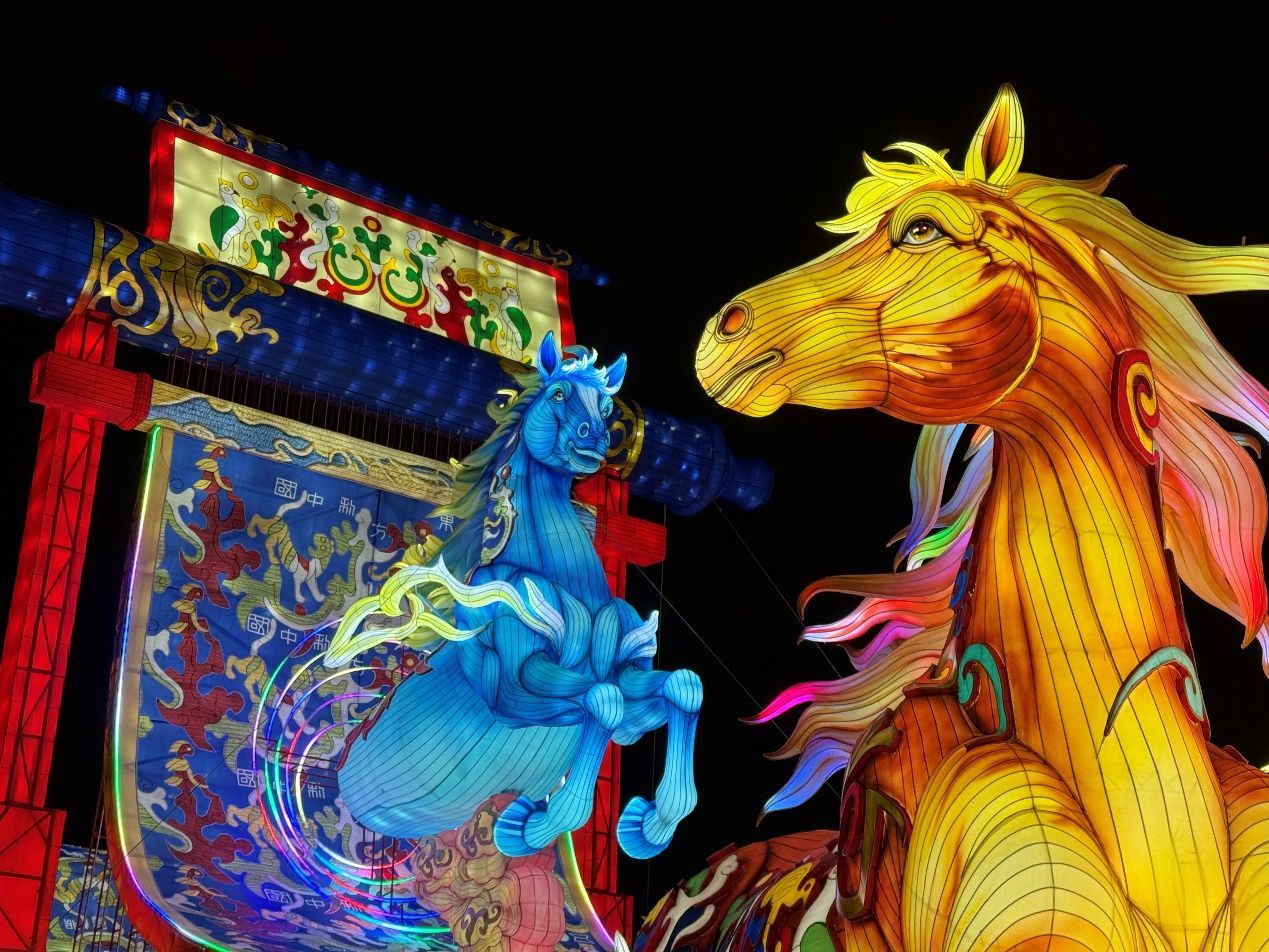 《神骏出东方》作为本届熊猫灯会的马年主题灯组,以“五星出东方利中国”锦护膊为灵感,巧妙结合RGB全彩灯光动态光影和机械传动技艺,融入山水和芙蓉等元素,组合成一幅骏马奔腾穿越蜀绣的灵动画卷,与本届熊猫灯会的主题遥相辉映。
