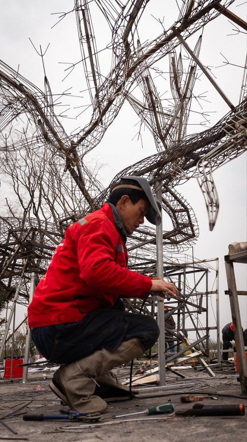 现场呈现的精彩,离不开设计师的巧思与工匠们的匠心坚守。在施工现场,扎灯工匠周师傅和他的伙伴们,已在东安湖连续施工多日。他们凭借丰富的国内外灯会制作经验,严格保障灯组的质量与观赏效果。“预计下个月月初就能完成全部灯组制作。”周师傅满是期待,“希望大家能喜欢我们用心做的灯”。