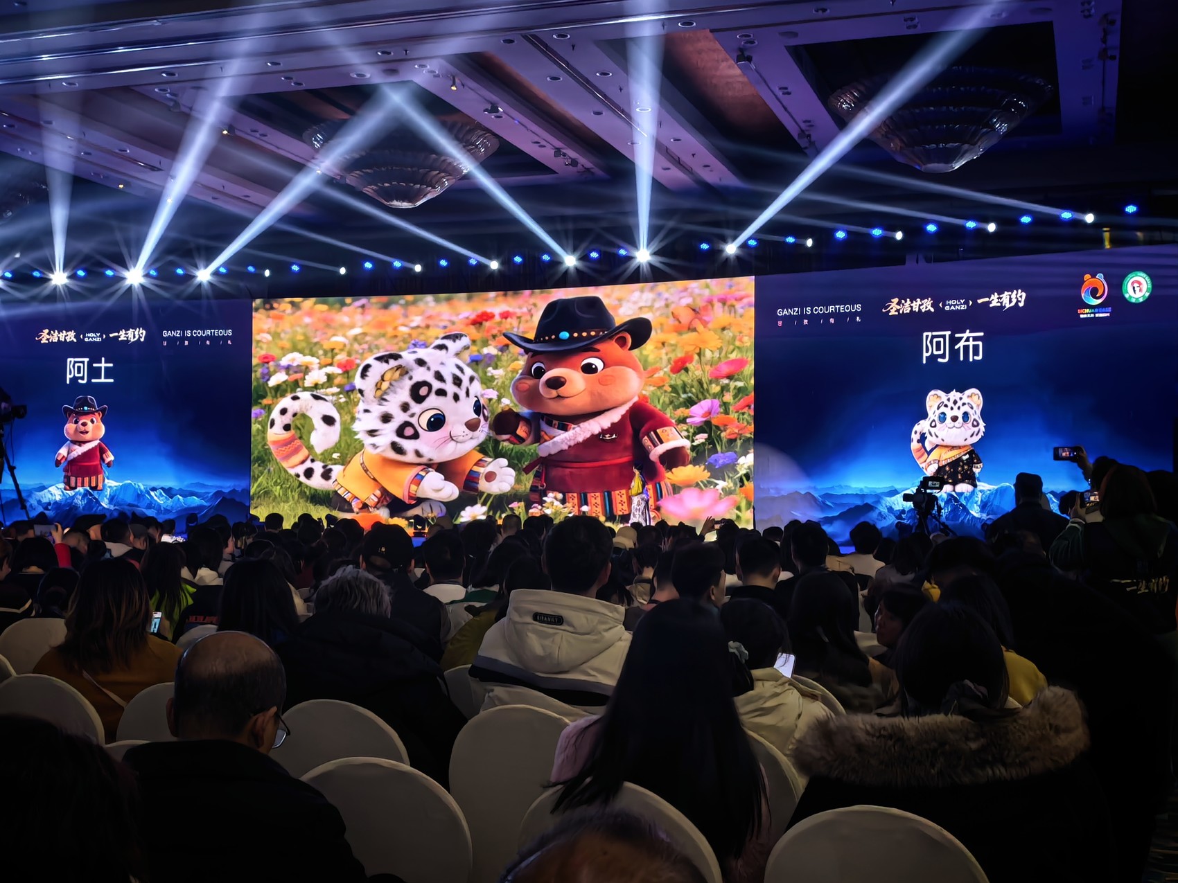 除了达人的助力,活动当天,甘孜文旅官方吉祥物IP形象首次公开亮相与科技化呈现。可爱的“土拨鼠阿土”与威武的“雪豹阿布”作为甘孜生态与文化的吉祥物正式登场。