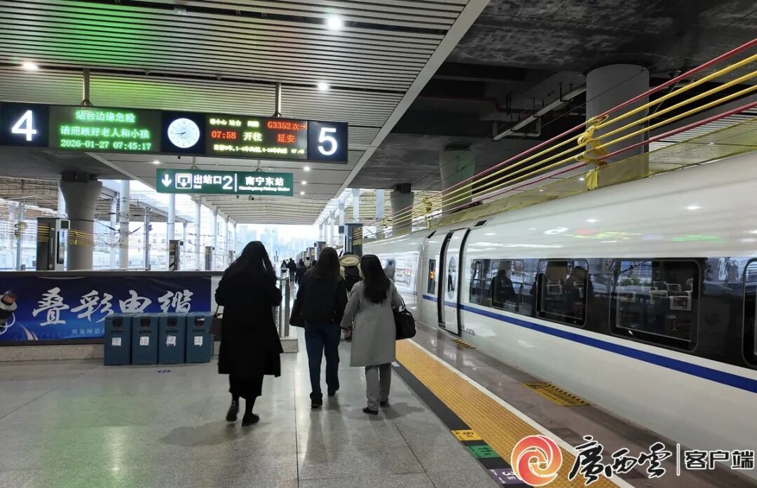 记者从国铁南宁局获悉,1月27日7时58分,首趟南宁东至延安的动车组列车G3352次驶出站台,标志着“绿城”南宁与“革命圣地”延安实现高铁直通,填补了两地无直达高铁的空白。据悉,这是国铁南宁局今年一季度调图的亮点之一,区内首次拥有直达延安的高铁,南宁至延安两地最快12小时19分可达,对促进两省区红色旅游资源共享,推动陕北革命老区振兴发展与广西北部湾经济区建设深度融合具有重要意义。