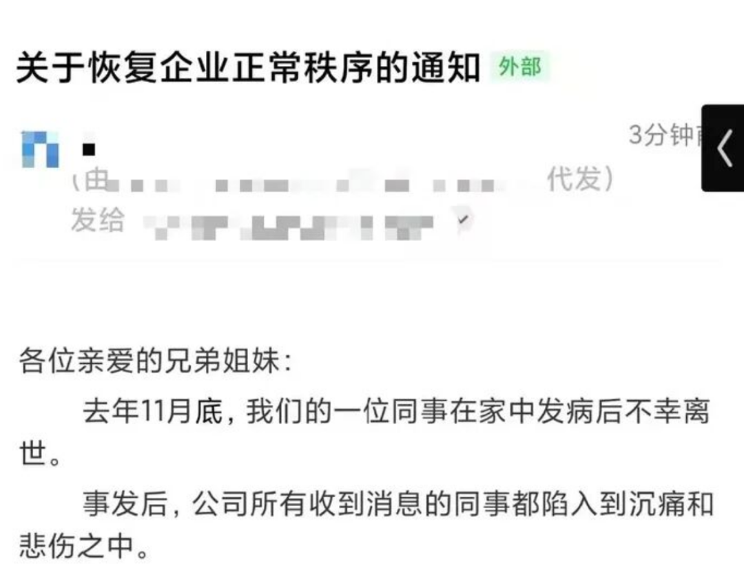 而上述提到的第二封邮件是一则“关于恢复企业正常秩序的通知”,其中写到,“各位亲爱的兄弟姐妹:去年11月底,我们的一位同事在家中发病后不幸离世。事发后,公司所有收到消息的同事都陷入到沉痛和悲伤之中。当天,恰逢几十位兄弟姐妹自发组织了公司一位工程师的生日活动。获悉不幸的消息后,活动现场立即撤掉了所有色彩鲜艳的装饰,同时取消了原计划中所有欢庆的内容,奏响音乐唱生日歌的环节也取消了。”邮件还提到,公司要求各部门尽可能暂停组织元旦新年庆祝活动,为纪念公司成立20周年策划的一系列全员大范围高规格的庆祝活动也取消了。与该同事所在部门、所在业务、所在远去相关度较高的各部,取消了年度总结活动中晚会的环节,仅保留了业务总结的内容。