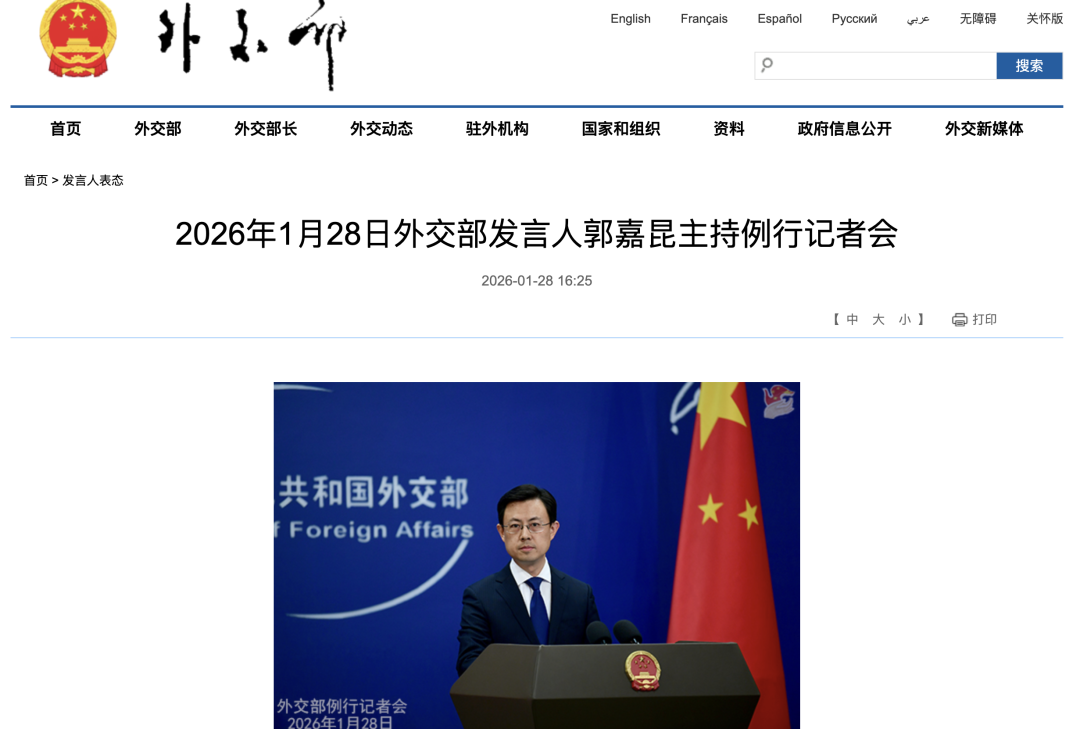 1月28日,外交部发言人郭嘉昆主持例行记者会。法新社记者提问,英国首相斯塔默今天开始对中国进行为期三天的访问,并在明天与中方领导人会见。外交部对此访有何预期?