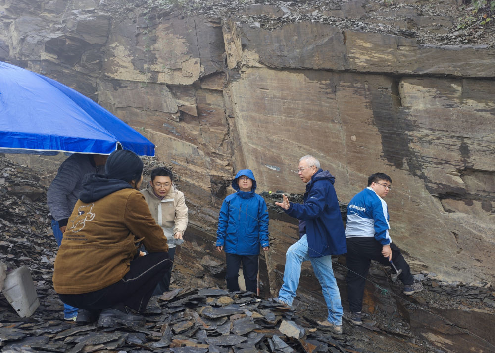 ↑中国科学院院士、研究员朱茂炎(右二)带领野外团队在湖南省湘西土家族苗族自治州花垣县石栏镇磨子村考察化石采坑(2024年11月18日摄)。新华社发