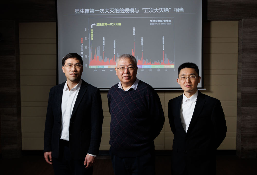 ↑1月22日,在中国科学院南京地质古生物研究所实验室,团队部分成员:中国科学院院士、研究员朱茂炎(中),研究员赵方臣(左),副研究员曾晗(右)合影留念。新华社记者 金立旺 摄