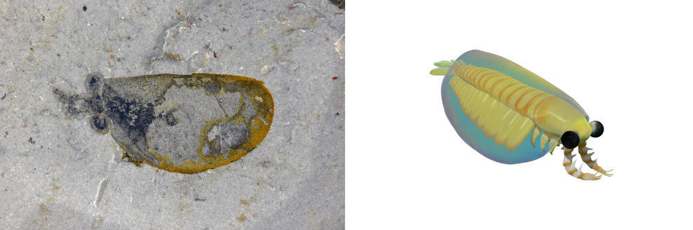 ↑花垣生物群射齿类节肢动物-赫德虾类化石图(左)和复原图。新华社发