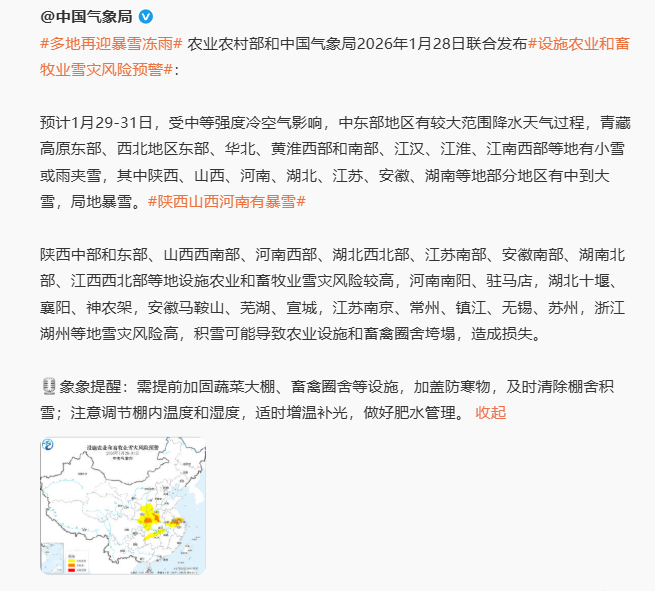 陕西中部和东部、山西西南部、河南西部、湖北西北部、江苏南部、安徽南部、湖南北部、江西西北部等地设施农业和畜牧业雪灾风险较高,河南南阳、驻马店,湖北十堰、襄阳、神农架,安徽马鞍山、芜湖、宣城,江苏南京、常州、镇江、无锡、苏州,浙江湖州等地雪灾风险高,积雪可能导致农业设施和畜禽圈舍垮塌,造成损失。