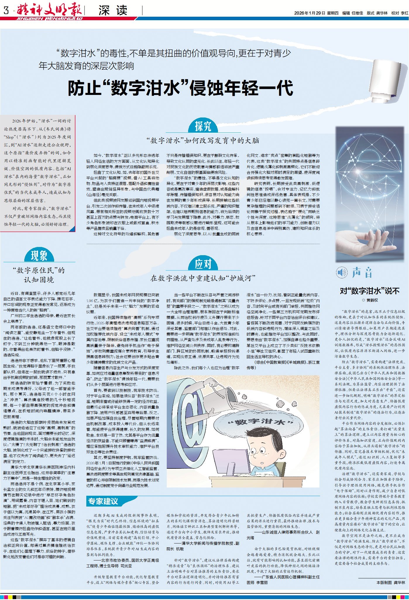 2026年伊始,“泔水”一词的讨论热度居高不下。从《韦氏词典》将“Slop”(“泔水”)列为2025年度词汇,到“AI泔水”逐渐走进公众视野,这个原指“廉价废弃物”的词,如今用以精准刻画智能时代里逻辑荒诞、价值空洞的低质内容。包括“AI泔水”在内的海量“数字泔水”,正如同无形的“侵蚀剂”,对作为“数字原住民”的当代未成年人,造成认知与思维层面的深层伤害。