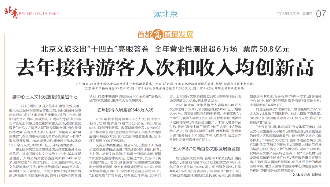 1月28日,北京青年报记者从北京市文化和旅游局获悉,“十四五”时期,首都文化和旅游领域在品质、规模、创新上实现重大突破。