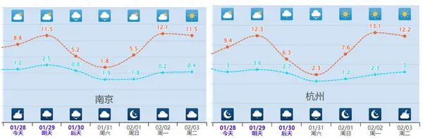 本次过程雨雪到来的同时还将伴随显著降温,未来三天,南方不少地方的冰冻感将会非常明显,尤其对于部分将经历雨雪过程的地区,可能会出现白天午后气温还低于前一天夜间的气温倒降情况。大城市中,郑州、合肥、武汉、南京、杭州、长沙最高气温都将从10℃左右下降到5℃或以下,其中南京、杭州29日至31日最高和最低气温都将跌至冰点上下,“冻感”十足!