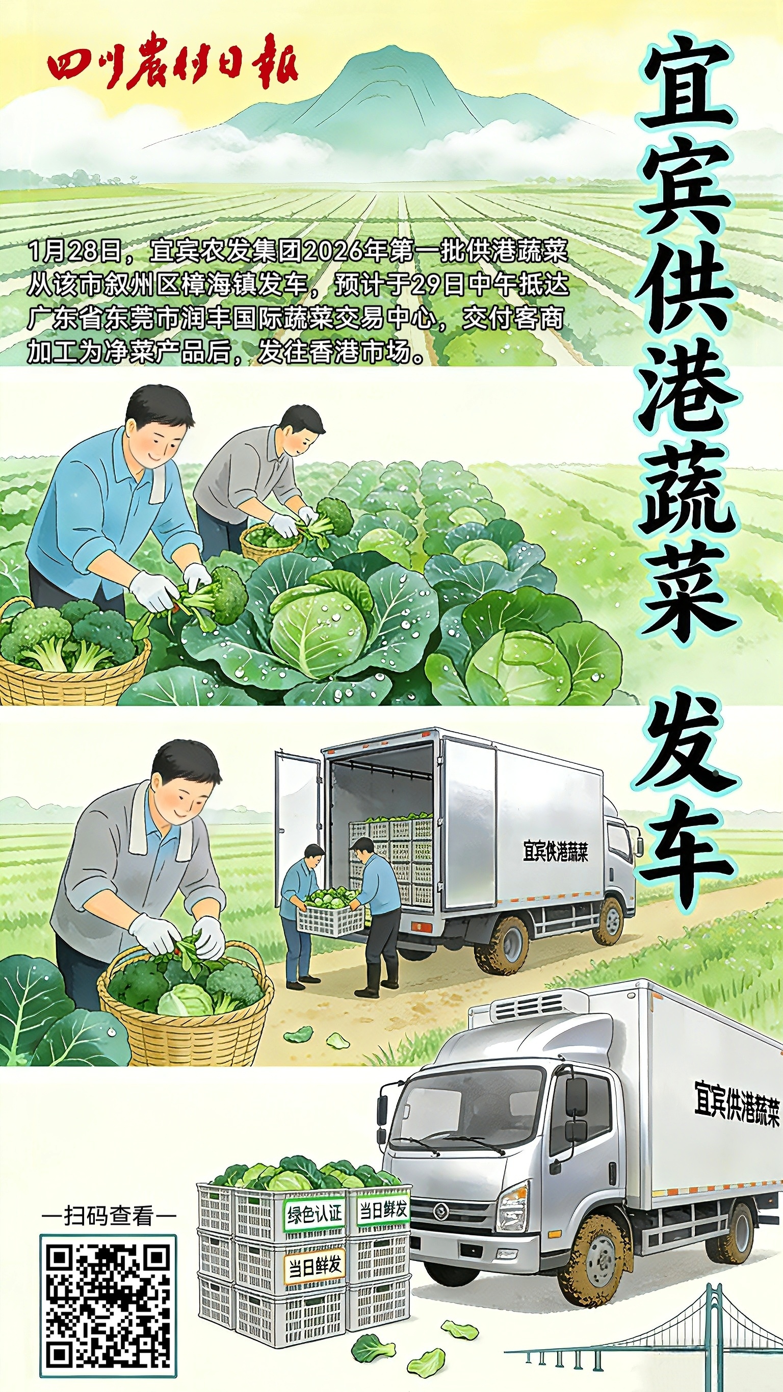 1月28日17时许,宜宾市农业发展集团有限公司(下称“宜宾农发集团”)2026年第一批供港蔬菜从该市叙州区樟海镇发车,预计于29日中午抵达广东省东莞市润丰国际蔬菜交易中心,交付客商加工为净菜产品后,发往香港市场。