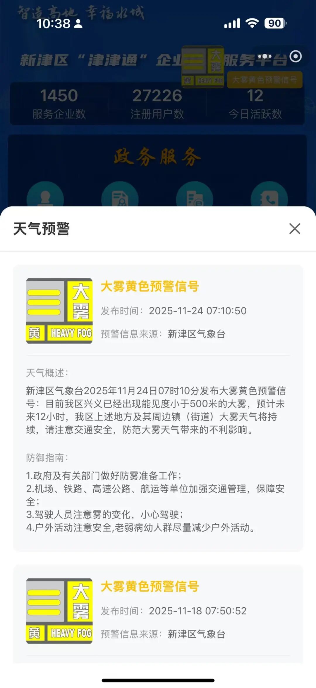 晨雾轻笼,四川成都新津经济开发区中粮生化(成都)有限公司副总经理张明一早打开手机,“津津通”企服平台推送的大雾橙色预警信息映入眼帘,附送的防御指南简明清晰。他随即将信息转发到工作群并布置工作:“按冬季应急手册准备,运输车辆尤其注意。”