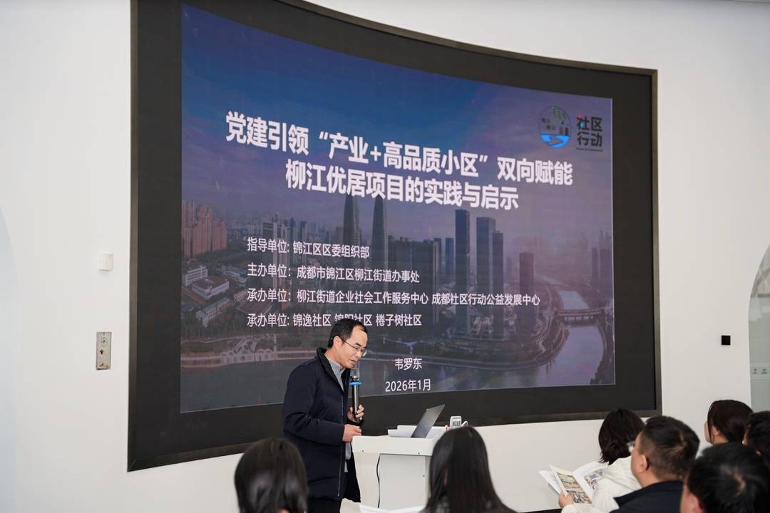 随后召开的总结会上,成都社区行动公益发展中心主任韦罗东首先作了系统性的项目成果汇报。他紧扣 “破解产城割裂”“回应治理有效”“探索资源转化” 等核心议题,系统阐述了项目推进中的实践路径与阶段性成效,展现了“双向赋能”模式从理论构想转化为实际行动的过程。