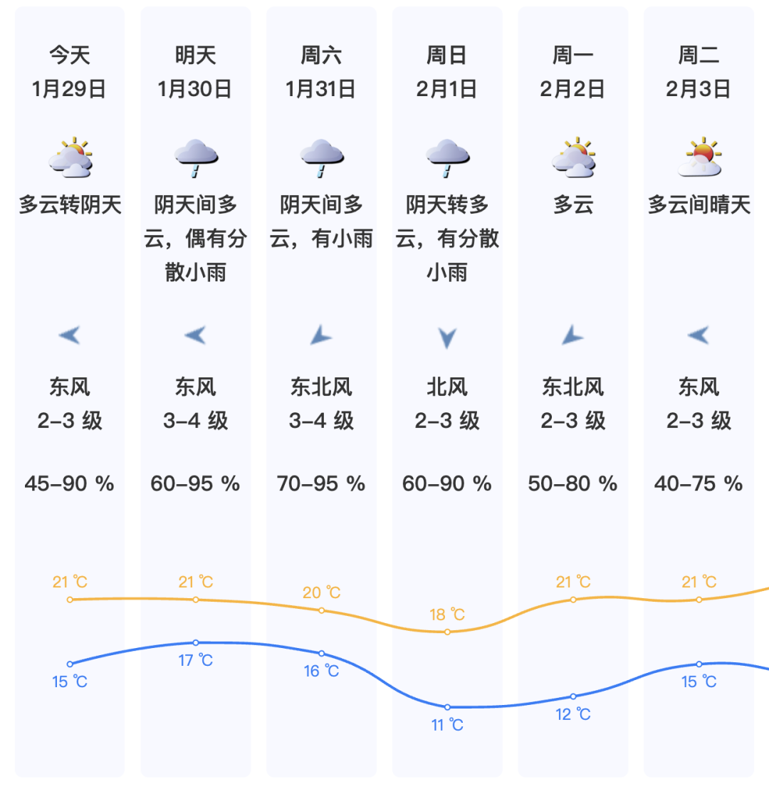 1月29日,多云转阴天,气温15℃-21℃;