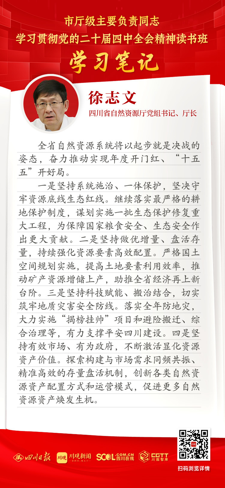 一是坚持系统施治、一体保护,坚决守牢资源底线生态红线。继续落实最严格的耕地保护制度,谋划实施一批生态保护修复重大工程,为保障国家粮食安全、生态安全作出更大贡献。二是坚持做优增量、盘活存量,持续强化资源要素高效配置。严格国土空间规划实施,提高土地要素利用效率,推动矿产资源增储上产,助推全省经济再上新台阶。三是坚持科技赋能、搬治结合,切实筑牢地质灾害安全防线。落实全年防地灾,大力实施“揭榜挂帅”项目和避险搬迁、综合治理等,有力支撑平安四川建设。四是坚持有效市场、有为政府,不断激活显化资源资产价值。探索构建与市场需求同频共振、精准高效的存量盘活机制,创新各类自然资源资产配置方式和运营模式,促进更多自然资源资产焕发生机。