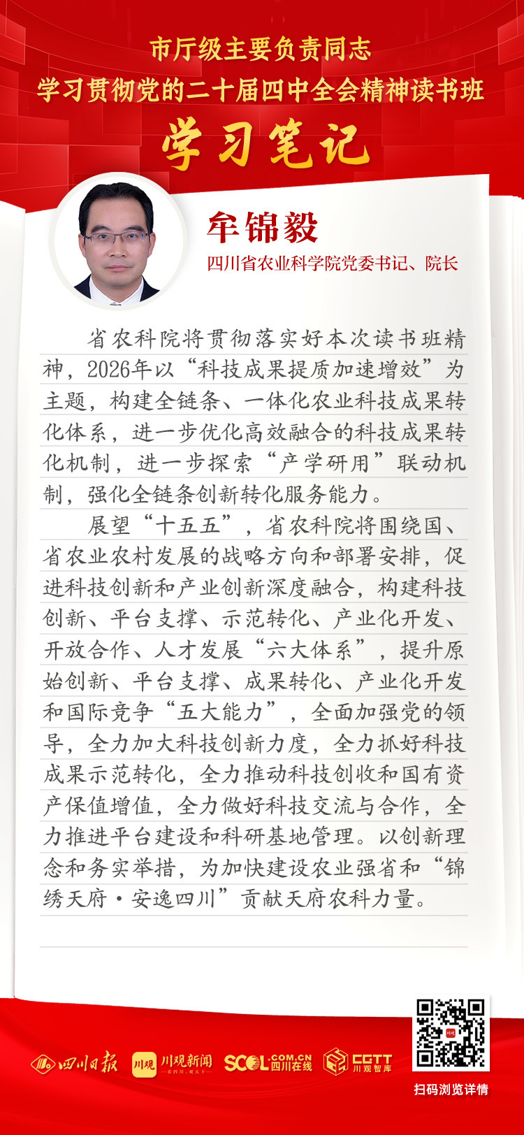 省农科院将贯彻落实好本次读书班精神,2026年以“科技成果提质加速增效”为主题,构建全链条、一体化农业科技成果转化体系,进一步优化高效融合的科技成果转化机制,进一步探索“产学研用”联动机制,强化全链条创新转化服务能力。