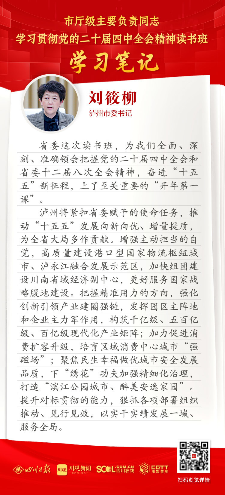 泸州将紧扣省委赋予的使命任务,推动“十五五”发展向新向优、增量提质,为全省大局多作贡献。增强主动担当的自觉,高质量建设港口型国家物流枢纽城市、泸永江融合发展示范区,加快组团建设川南省域经济副中心,更好服务国家战略腹地建设。把握精准用力的方向,强化创新引领产业建圈强链,发挥园区主阵地和企业主力军作用,构筑千亿级、五百亿级、百亿级现代化产业矩阵;加力促进消费扩容升级,培育区域消费中心城市“强磁场”;聚焦民生幸福做优城市安全发展品质,下“绣花”功夫加强精细化治理,打造“滨江公园城市、醉美安逸家园”。提升对标贯彻的能力,狠抓各项部署组织推动、见行见效,以实干实绩发展一域、服务全局。