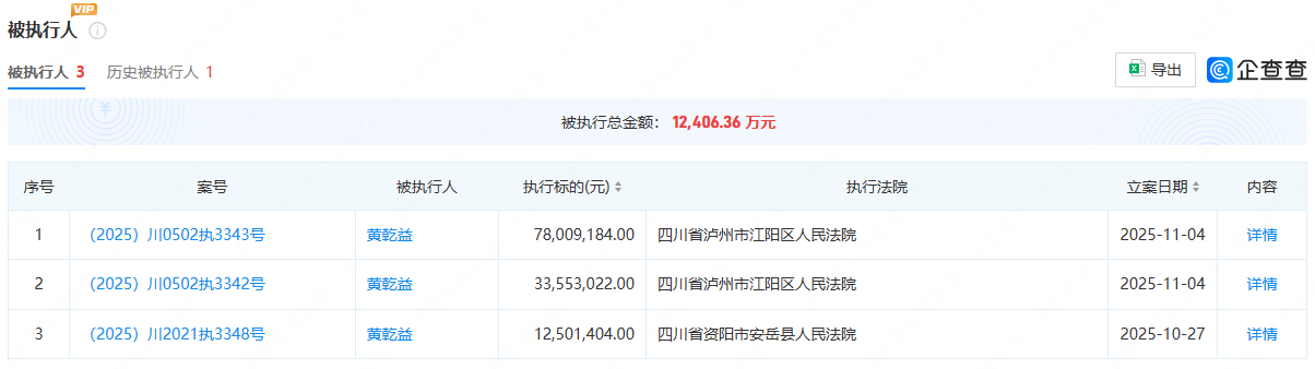 截至目前,黄乾益仍持有公司6.426%股份,为公司第二大股东,但其持有的全部股份均已被司法冻结,且存在多条被执行人信息,被执行总金额已超过1.24亿元。
