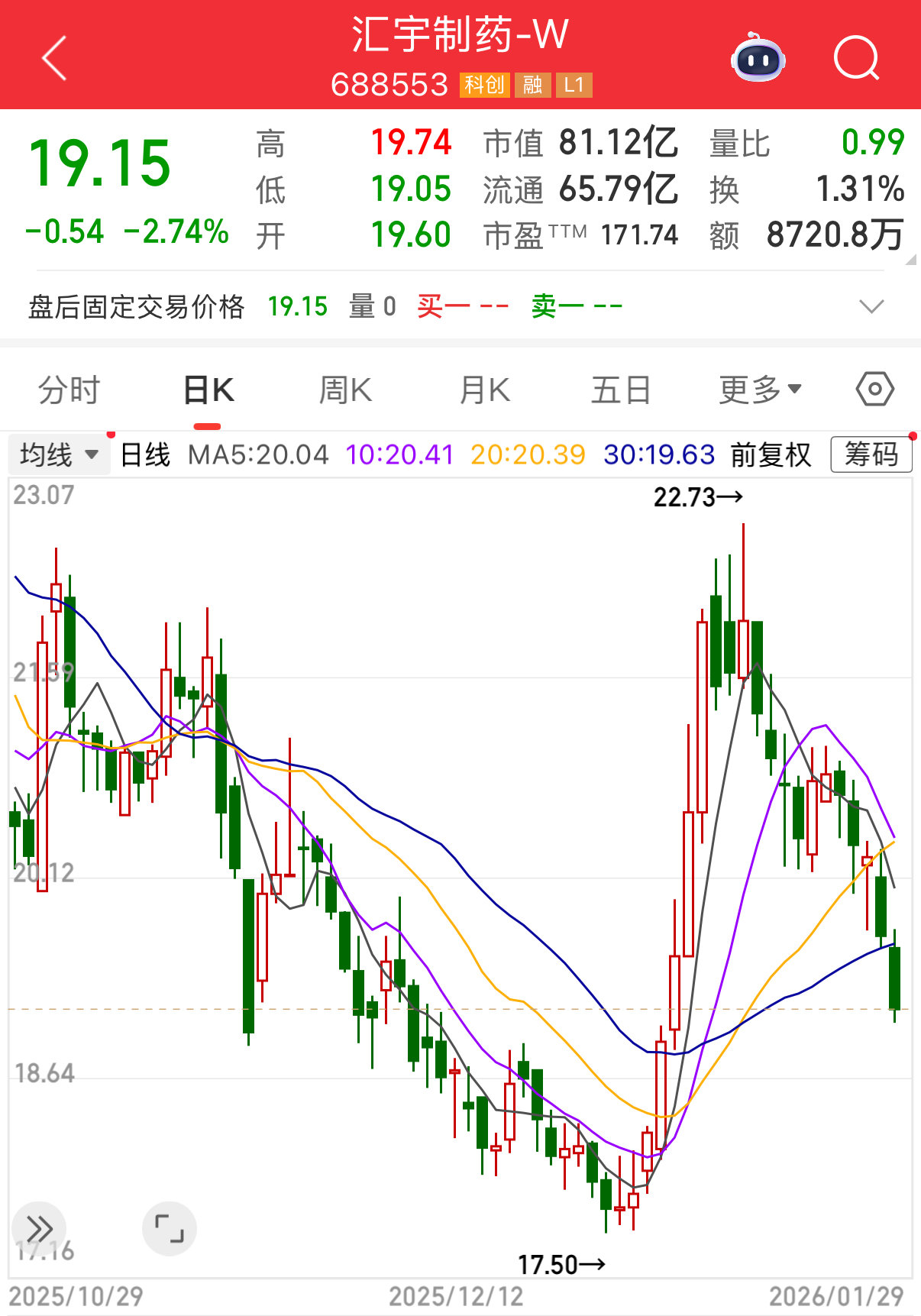 截至1月29日收盘,汇宇制药股价下跌2.74%,报19.15元/股,总市值81.12亿元。