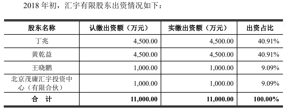 2010年10月,浙江茂源神华药业有限公司(出资占比45%)、丁兆(出资占比43%)、王晓鹏(出资占比10%)、余波(出资占比2%)共同创办汇宇制药。其中,浙江茂源神华药业有限公司系代黄炳全持有汇宇制药45%股权,且实际出资均来源于黄炳全。2012年10月代持还原后,黄炳全显名登记,浙江茂源神华药业有限公司不再作为名义股东且退出公司,并办理工商变更登记手续。至2018年初,公司股东名单中黄炳全所持股份已变更为由黄乾益持有,出资比例达40.91%,与实控人丁兆并列。
